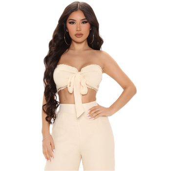 Của phụ nữ KỲ NGHỈ HÈ trang phục giản dị mô hình rắn hai mảnh quần thiết lập strapless smocked Top BOW TIE phía trước chi tiết quần dài